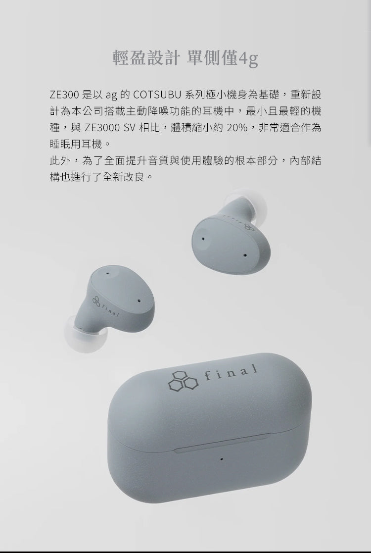 Final ZE300 延續 final 旗下 ag 品牌 COTSUBU 系列的極致輕盈設計理念,每邊耳機僅重 4g,體積比 ZE3000 縮小約 20%。這款耳機特別適合耳朵較小的使用者,即使長時間佩戴也不會感到壓迫或不適。獨特的人體工學設計確保耳機能穩固貼合,無論是日常通勤、運動健身,或是睡眠時使用,都能提供卓越的舒適度。