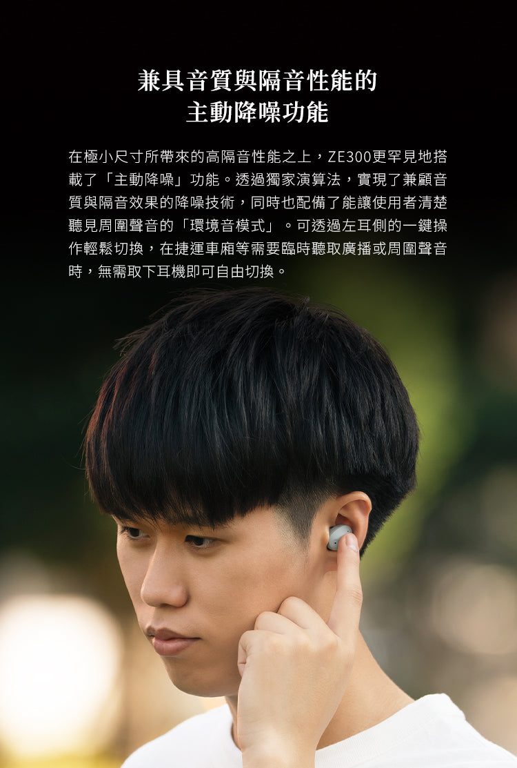 ZE300 採用先進的主動降噪技術,透過獨家演算法有效平衡降噪性能與音質表現。不同於市面上許多降噪耳機在開啟降噪功能後會影響音質,ZE300 能夠在保持音樂細節清晰的同時,有效隔絕外界噪音。無論是在嘈雜的通勤環境、辦公室,或是咖啡廳,都能讓您沉浸在純淨的音樂世界中。