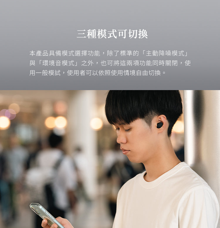 • 三種聆聽模式:主動降噪模式、環境聲模式、普通模式,一鍵切換適應不同場景