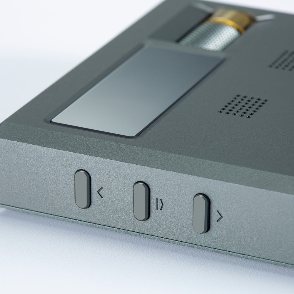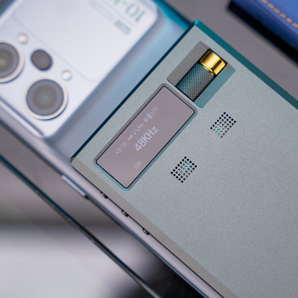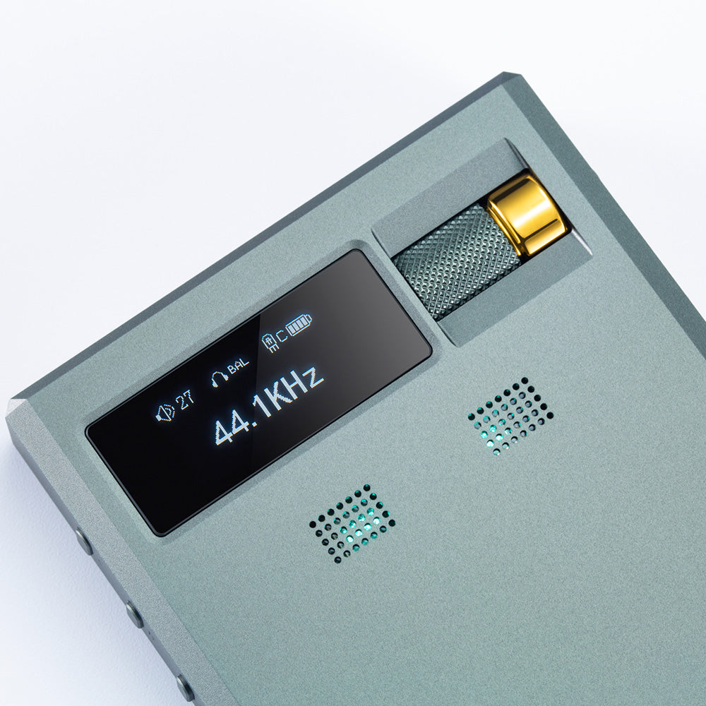 側面的多色 LED 指示燈會即時顯示充電狀態(充電中為紅燈)以及目前的取樣率資訊。正面配備 0.96 吋彩色螢幕,可以隨時查看電池電量圖示、音量大小、運作模式及輸入音源等各項資訊,螢幕亮度也可根據環境光源調整來節省電力。