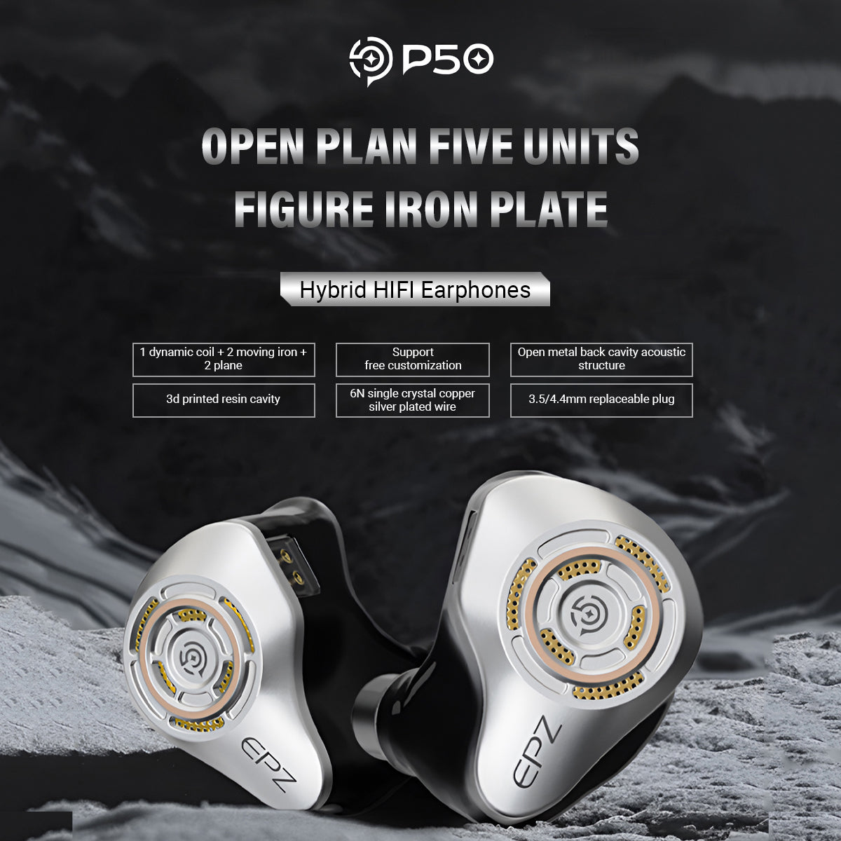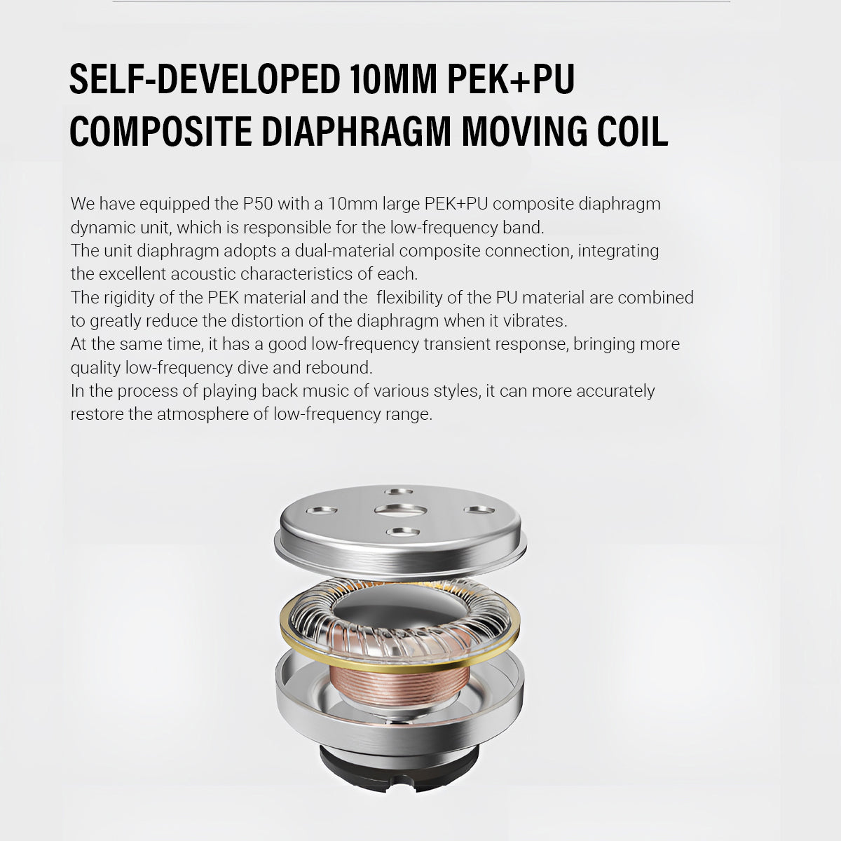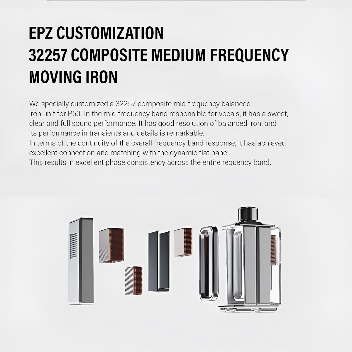 EPZ P50採用獨特的「一圈兩鐵兩平板」五單體混合架構設計,融合EPZ自研聲學科技與高精度製程工藝。動圈單體採用10mm大尺寸PEK+PU複合振膜,負責低頻頻段表現,振膜採用雙材質複合結合,整合了各自優異的聲學特性,具備良好的低頻瞬態響應,帶來更優質的低頻下潛和反彈。中頻部分由兩個EPZ特別客製的32257複合中頻動鐵單體負責,在負責人聲的中頻段有著甜美、清晰、韻味十足的聲音表現,具備動鐵的良好解析力,在瞬態和細節方面表現出色。