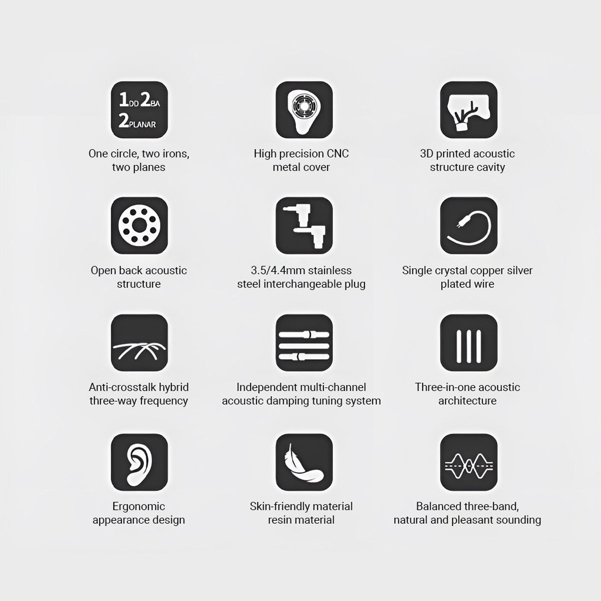 標配的線材為6N單晶銅鍍銀線,結合中性銅與通透銀的雙重優勢,提供乾淨細膩的音色,在聲音上呈現出均衡清新自然的風格。線材柔軟並覆有織物保護套,展現輕微的自捲特性。金屬插頭採用304不鏽鋼製成,並配備3.5mm與4.4mm可更換插頭,採用真空電鍍工藝,兼顧美觀與實用。人體工學設計確保長時間聆聽的舒適性,輕量化結構在長時間聆聽過程中不會產生疲勞感,是休閒聽眾和認真的音響愛好者花費數小時沉浸在音樂中的理想選擇。