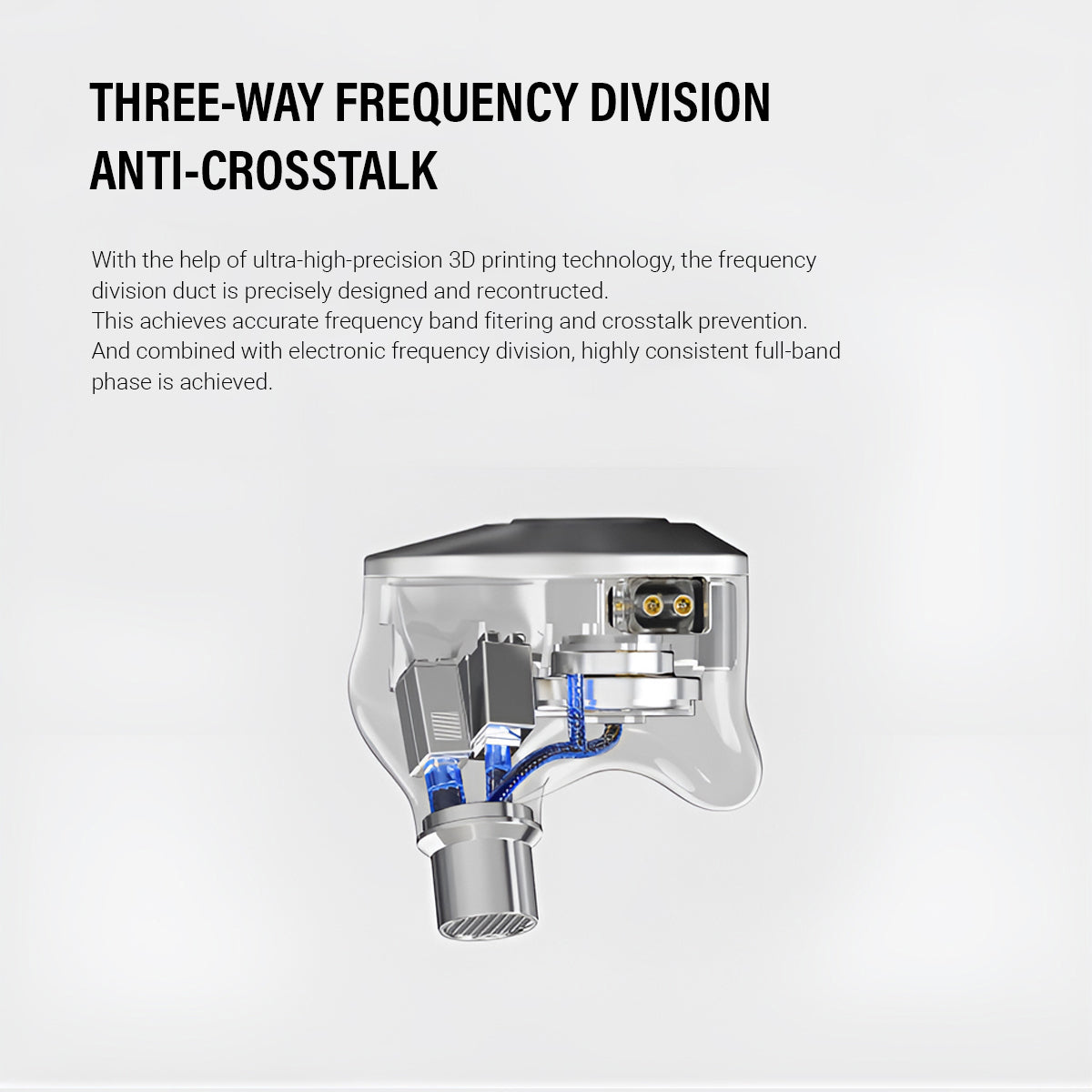 P50採用兩個EPZ第二代微型平板單體,負責高頻音域表現。這款微型平板單體擁有媲美動鐵單體的精緻工藝和小巧體積,同時具備更強的可靠性,規避了動鐵單體可能出現的失真或故障情況。平板單體在高頻方面有著更好的延伸以及更為柔和的音色和豐富的細節,高頻華麗優雅、細膩、悅耳透明,是這款耳機的一大特色所在。三個不同類型的單體各司其職,透過三路分頻設計實現精確的頻段分工,防止串擾,結合電子分頻,達到全頻段高度一致的相位表現。