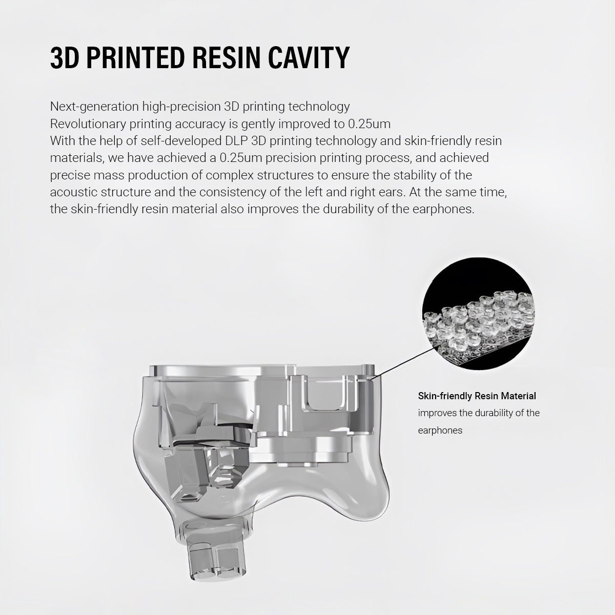 耳機外殼使用高精度DLP 3D列印樹脂技術,達到0.25μm的精度,左右腔體一致性優異。親膚材質提升了佩戴舒適度與耐用性,搭配人體工學外型設計,長時間配戴依然穩固舒適。透明3D列印樹脂腔體清楚展現內部精密結構,獨立嵌入式金屬導音嘴提升耐用性和聲音精確度。這種深思熟慮的材質與設計元素組合,造就了一款在視覺上吸引人且在功能上卓越的產品。