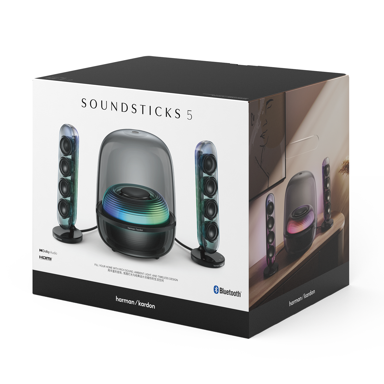 SoundSticks 5 主機(含左右聲道衛星喇叭與重低音喇叭)、電源線、快速入門指南、安全說明與保固卡 |