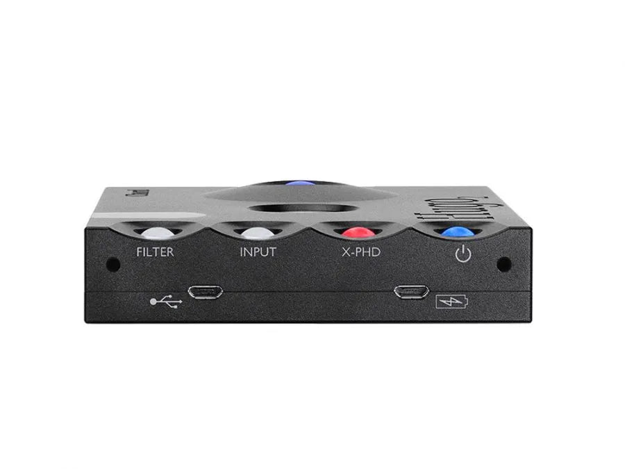 Hugo 2 最具辨識度的外觀特徵就是機身頂部的四顆球形控制按鍵。這些按鍵不僅是操作介面,本身還會發出彩色燈光,以顏色編碼方式顯示當前的工作狀態。由左至右依序為:濾波模式切換鍵、輸入源選擇鍵、交叉饋送(Crossfeed)功能鍵、電源開關鍵。每個按鍵在不同設定下會顯示不同顏色,例如輸入源鍵會根據當前選擇的輸入(USB、光纖、同軸、藍牙)顯示對應顏色;電源鍵則會根據電池電量顯示不同顏色,從綠色(充飽)漸變至紅色(低電量),讓您一眼就能掌握設備狀態。音量控制則透過兩側的球形按鍵進行增減,採用數位音量控制技術,以精確的 1dB 為單位調整,並同樣以燈光顏色變化顯示當前音量等級。這種創新的設計不僅操作直覺便利,更為 Hugo 2 增添了獨特的視覺魅力與辨識度。