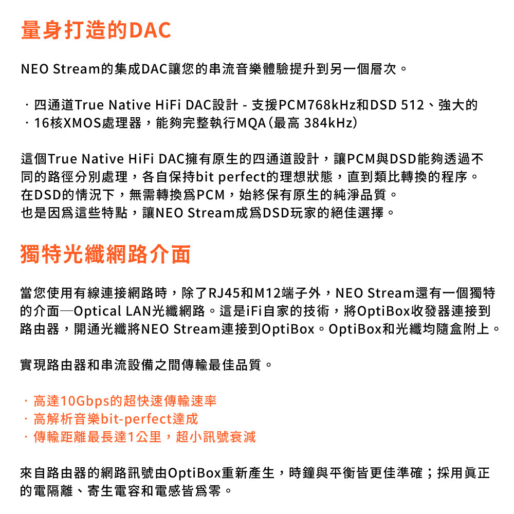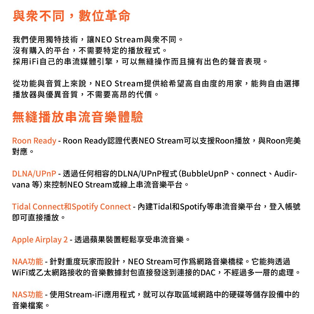 iFi Audio NEO Stream是專為追求極致音質的音樂愛好者所設計的網路串流DAC。它結合了iFi最新世代的網路串流引擎與屢獲殊榮的DAC解碼技術,在中階價位帶提供了過往只有高階機種才能達到的音質表現。NEO Stream採用iFi自主研發的串流引擎,而非採購現成的串流平台方案,因此能夠針對音質表現進行最佳化調校,同時保有開放式架構的靈活性,讓使用者可以自由選擇習慣的控制APP與音樂平台,不受特定生態系統束縛。這種設計哲學讓NEO Stream在功能性與音質表現上都能滿足挑剔的發燒友需求。