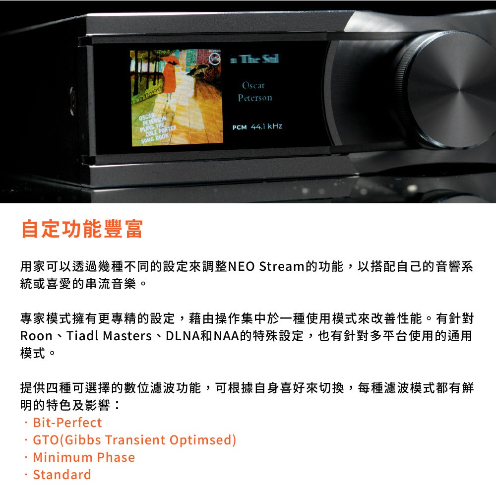 NEO Stream內建4種數位濾波器,讓您可以根據音樂類型或個人喜好微調聲音表現。Bit-Perfect模式提供完全不經修改的原始聲音;GTO(Gibbs Transient Optimised)模式針對暫態響應進行優化,呈現更銳利的動態表現;Minimum Phase模式著重相位準確性,提供更自然的音場定位;Standard模式則是平衡各方面表現的標準設定。此外,NEO Stream提供了專屬的串流模式切換功能,包括Tidal專用模式、Roon專用模式、NAA模式及DLNA模式,每種模式都針對該平台的特性進行了優化,確保最佳的性能表現與聲音品質。這些彈性的調整選項讓您能夠針對不同的音樂內容與聆聽環境,找到最適合自己的聲音設定。