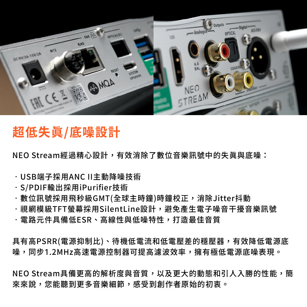 iFi Audio在NEO Stream上投注了大量心血來消除音訊訊號中的雜訊與失真。所有USB端口都採用了第二代ANC(Active Noise Cancellation)主動降噪技術,能夠主動偵測並消除USB傳輸中的電氣雜訊;S/PDIF數位輸出則整合了iFi著名的iPurifier淨化技術,有效去除數位訊號中的失真成分。此外,USB及S/PDIF介面都由飛秒級精密時鐘進行校正,徹底根除時基誤差(jitter)問題。機身內部採用全平衡雙單聲道電路架構,使用高品質TDK C0G、Panasonic OS-CON及鉭質電容提供穩定的電源供應,訊噪比高達106dB以上,總諧波失真低於0.007%。甚至連OLED顯示螢幕都採用SilentLine靜音設計,透過FET開關及微控制器管理,確保顯示功能不會對音訊播放產生任何電氣干擾。這些細緻入微的設計讓NEO Stream能夠呈現出更清晰的細節、更豐富的質感,以及更動態生動的音樂表現。