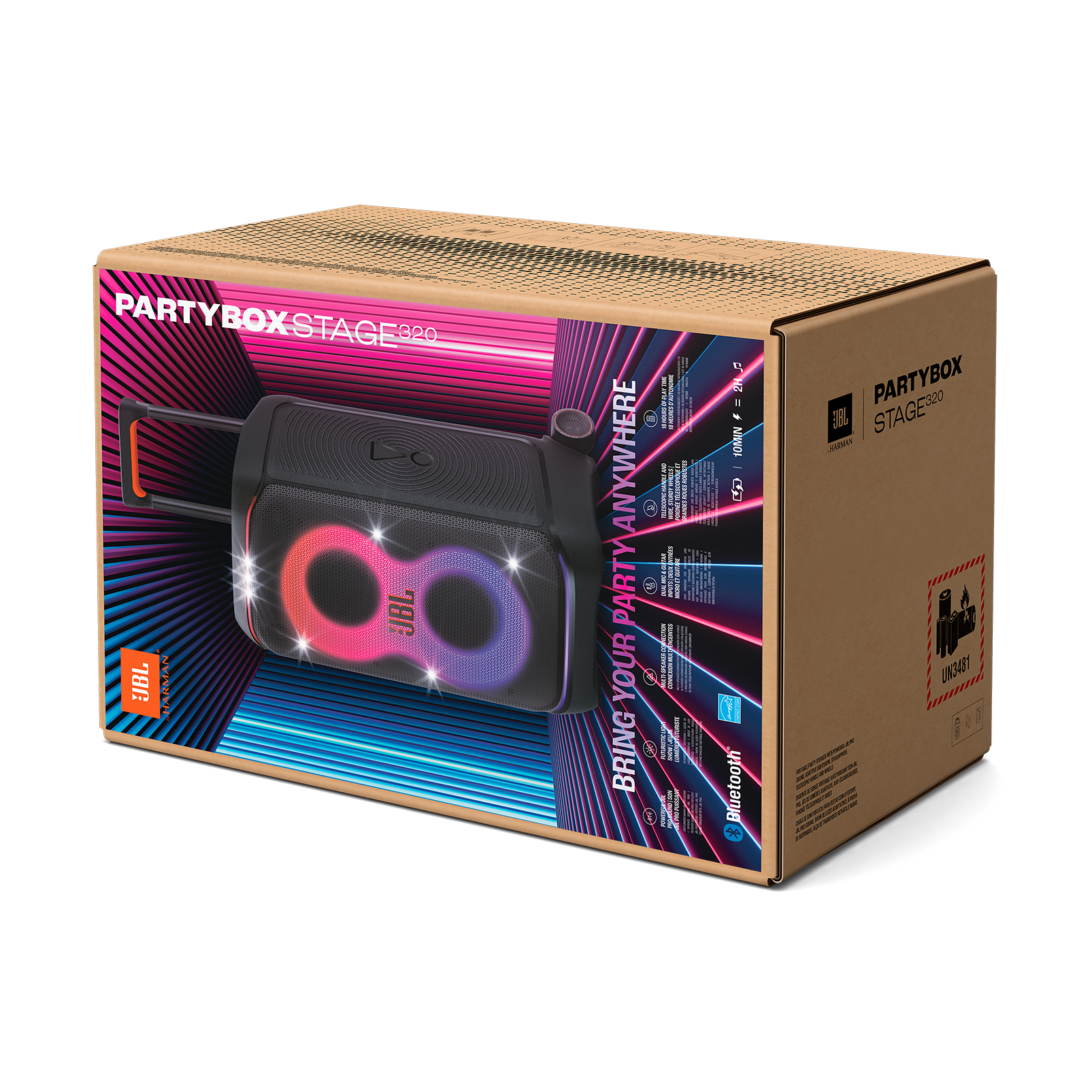 JBL PartyBox Stage 320 帶來前所未有的聽覺震撼。內建兩個高靈敏度的 6.5 吋低音單體與兩個 25mm 圓頂高音單體,能呈現深沉強勁的低音與水晶般清晰的高音。搭配先進的 AI Sound Boost 技術,透過人工智慧演算法即時監測喇叭動態,不僅能保護單體避免過載,更能大幅減少大音量下的失真,讓您在任何音量下都能享受最飽滿、最震撼的 JBL Pro Sound 標誌性音效。