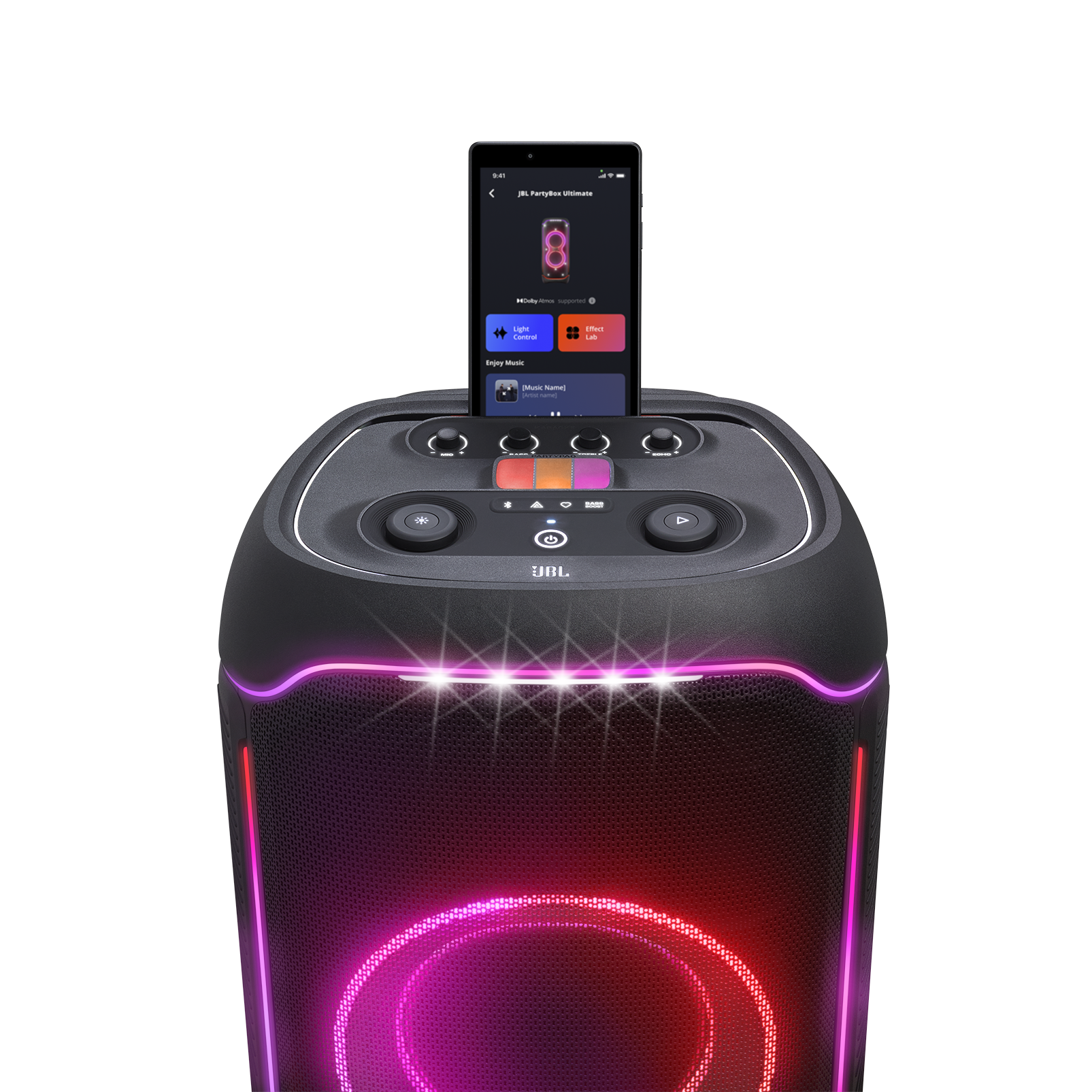 PartyBox Ultimate 配備 JBL PartyBox 系列中最大型、最震撼的多維度燈光秀系統。這套燈光系統包含獨特的星空夜景效果、酷炫的光影軌跡、動態閃光燈,甚至還有能夠投射到地面或任何表面的環境燈光。所有燈光效果都能與音樂節奏完美同步,創造出視覺與聽覺的雙重震撼。您可以透過機身頂部簡潔直覺的控制旋鈕,或使用 JBL One App 進行更細緻的燈光自訂,包括顏色選擇、圖案變化、閃爍速度等參數。燈光模式包括 NEON、LOOP、BOUNCE、TRIM、SWITCH 和 FREEZE 等多種選擇,讓您可以根據派對氛圍隨時切換,打造專屬於您的視覺饗宴。