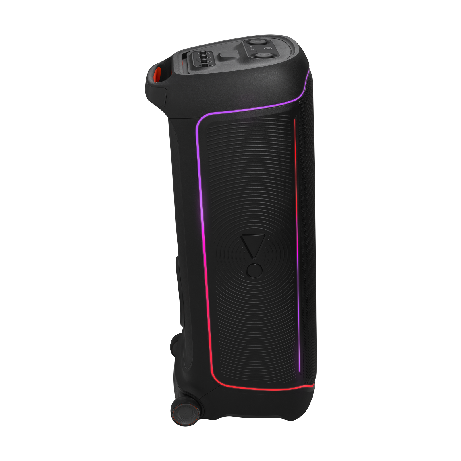雖然 PartyBox Ultimate 重達 39.5 公斤,但其設計充分考慮了便攜性。配備易握把手和寬大堅固的滾輪,讓您可以像拖行李箱一樣輕鬆移動喇叭。滾輪運轉順暢,即使在不平整的地面上也能輕鬆推動。外殼採用堅固的塑膠材質製成,搭配金屬網罩保護內部單體,確保喇叭能夠承受派對現場的各種碰撞和移動。機身背面還設有簡單而有效的線材管理系統,配備線材收納櫃,可以在不使用時妥善收納電源線,確保線材不會妨礙您的移動或造成絆倒危險。機身頂部的控制面板設計簡潔直覺,所有重要功能都可以直接操作,無需依賴手機 App。